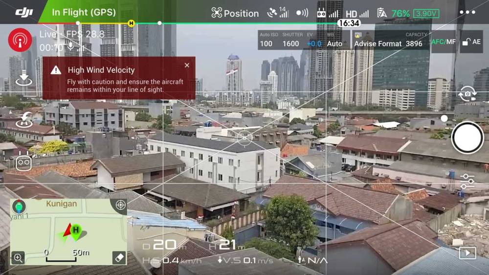 Dengan kondisi seperti itu, mengharuskan saya untuk terbang lumayan rendah; sekitar 4 sampai dengan 6 meter dari permukaan tanah (sesuai ketinggian kalkulasi dari IMU). Selain itu juga adalah pancaran cahaya dari lighting panggung yang kerap mengganggu konsentrasi ketika memantau pergerakan drone. Dan karena saya terbang sendiri (DJI Mavic Pro juga bisa digunakan oleh 2 operator secara bersamaan), maka saya wajib memantau pergerakan arah drone, arah angin dan posisi ketinggian Mavic-nya yang lumayan tidak stabil karena VPS tidak berfungsi maksimal dan saya tidak leluasa untuk menyimak footage yang saya rekam.