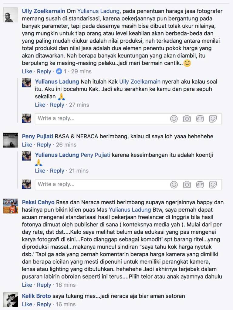Beberapa hari belakangan ini ramai jadi perbincangan tentang sebuah diskusi antara seorang fotografer dengan calon kliennya. Yang membuat perbincangan diantara mereka ramai itu adalah soal harga/tarif sang fotografer. Perbincangan itu menimbulkan banyak reaksi; ada yang setuju dengan sang fotografer, namun tidak sedikit pula yang sepakat dengan si calon klien.
