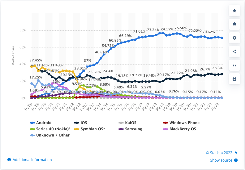 Hal tersebut mungkin tidak akan berarti apa-apa karena menurut Statista pada laporan yang bertarikh 16 November 2022, saat ini jumlah pengguna sistem operasi Android masih tetap menguasai pasar sistem operasi dunia (khususnya telepon seluler) dengan prosentase sebesar 71% sedangkan pengguna sistem operasi iOS hanya 28%.