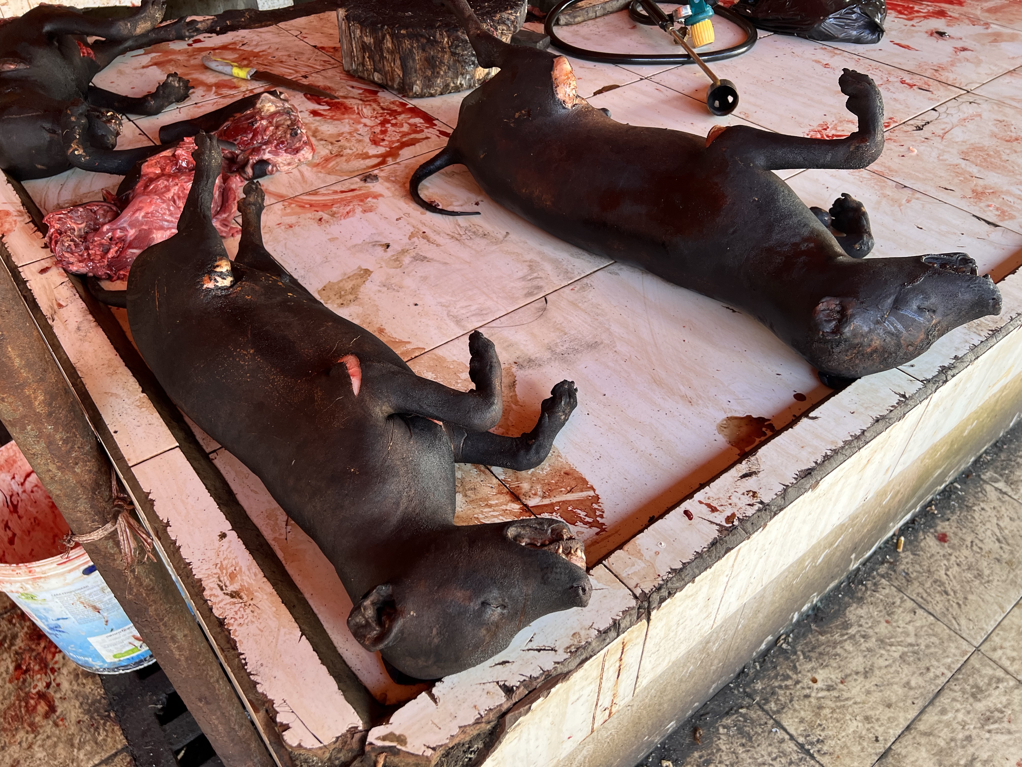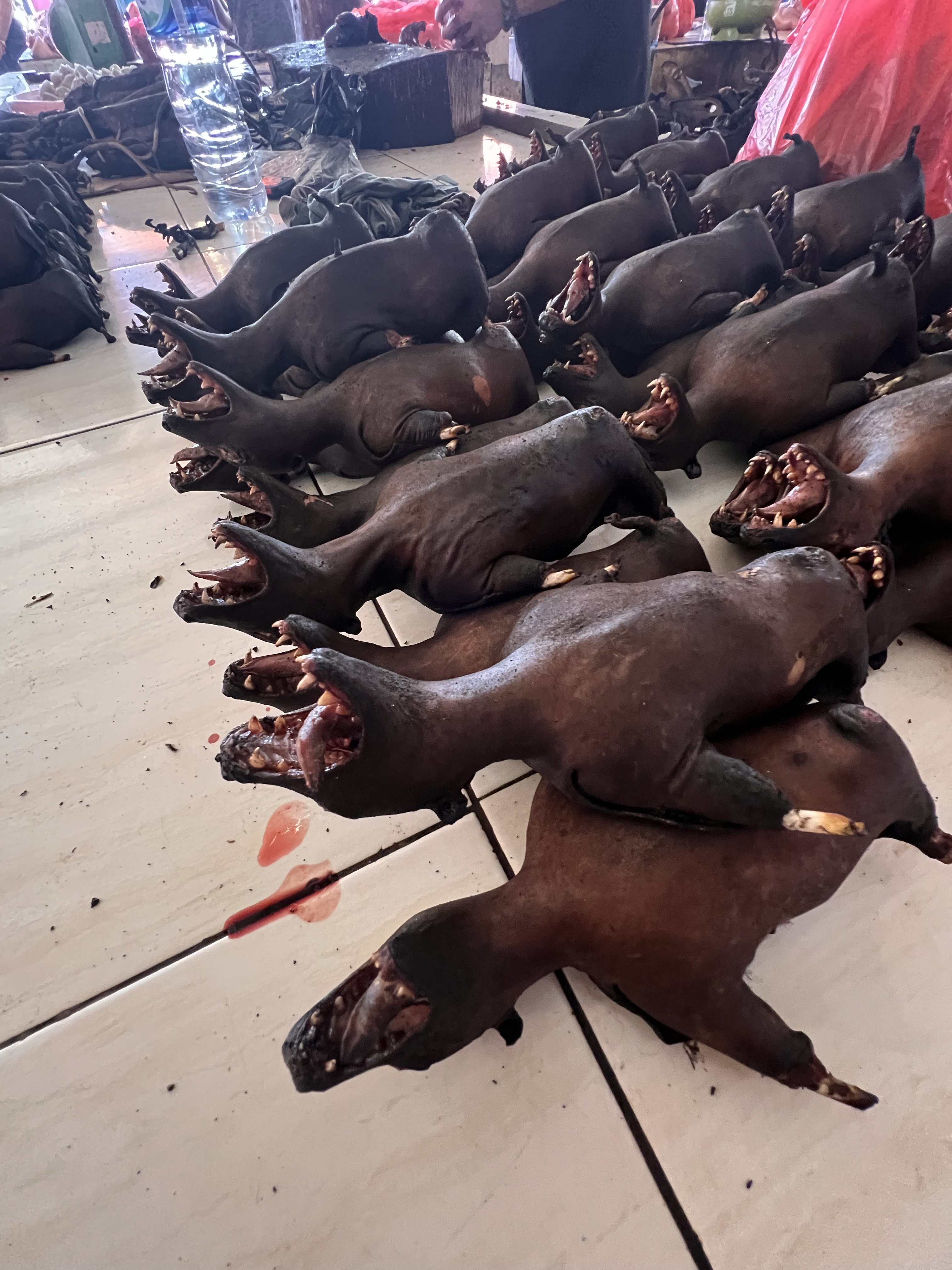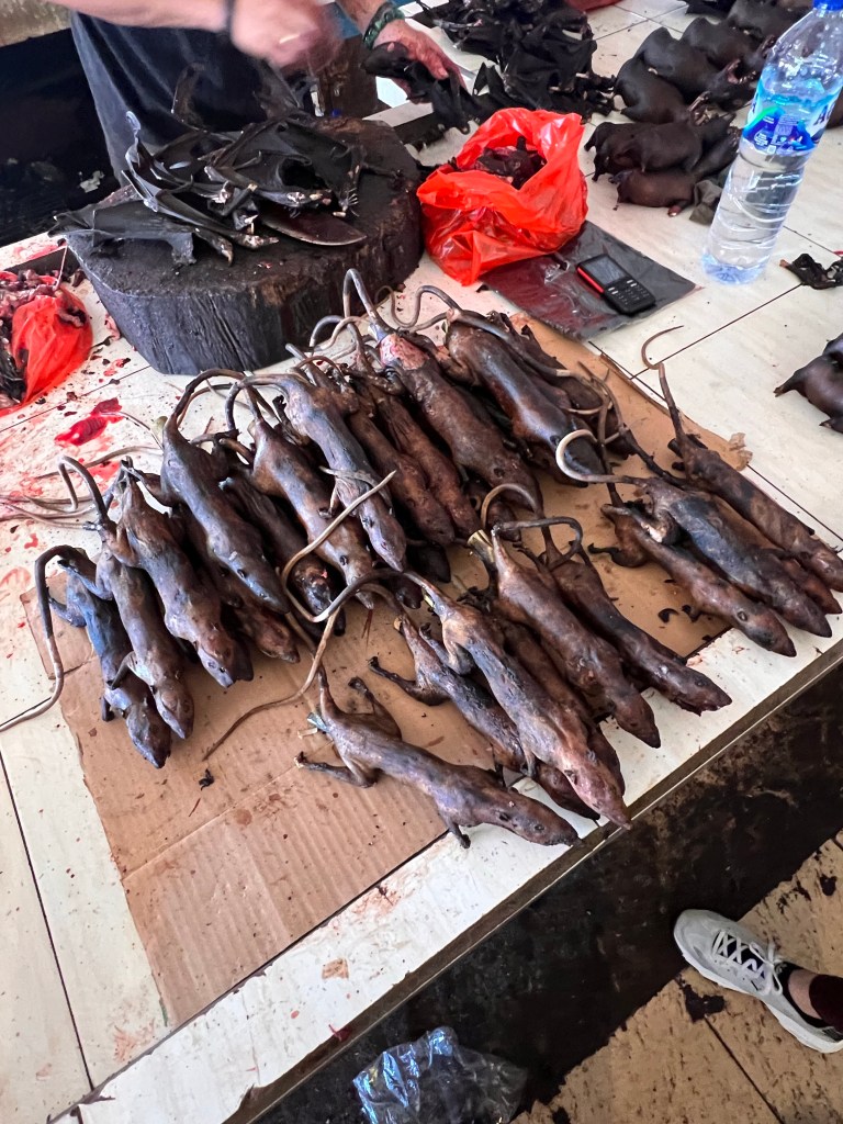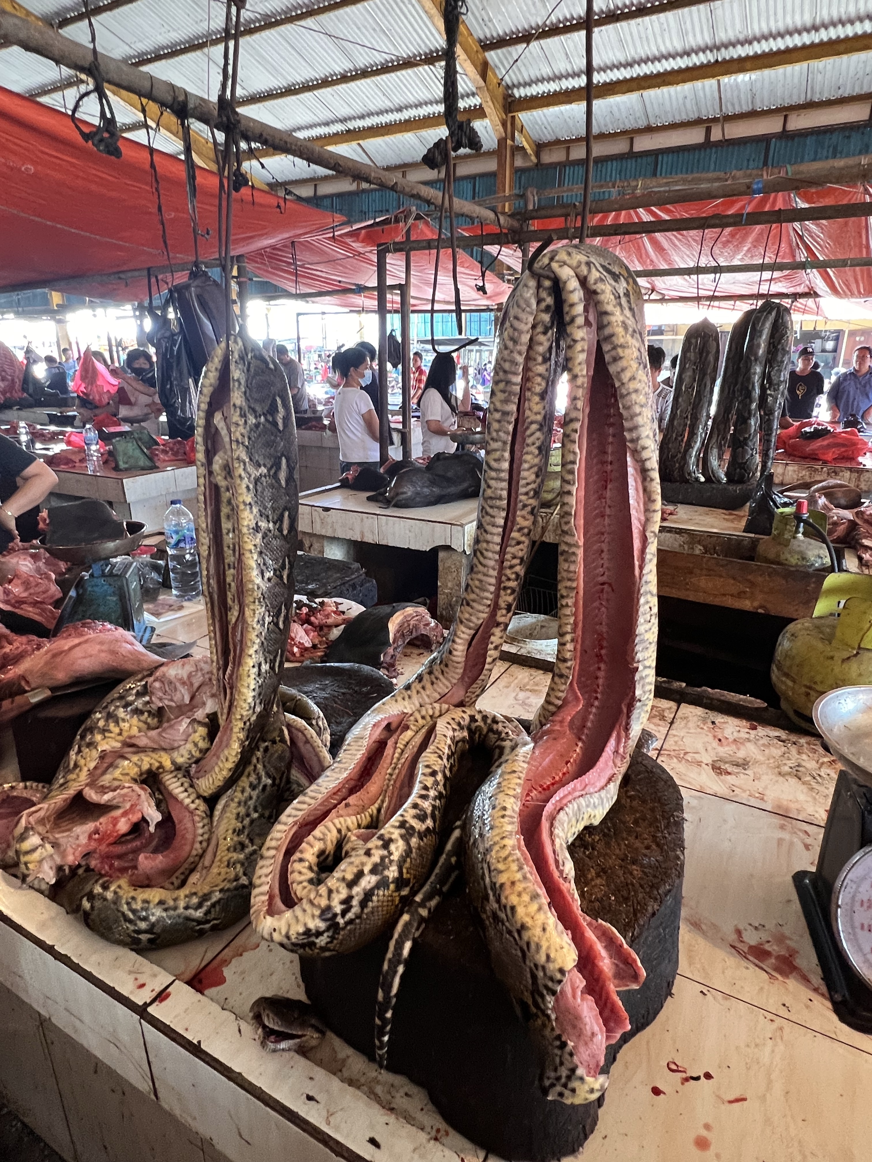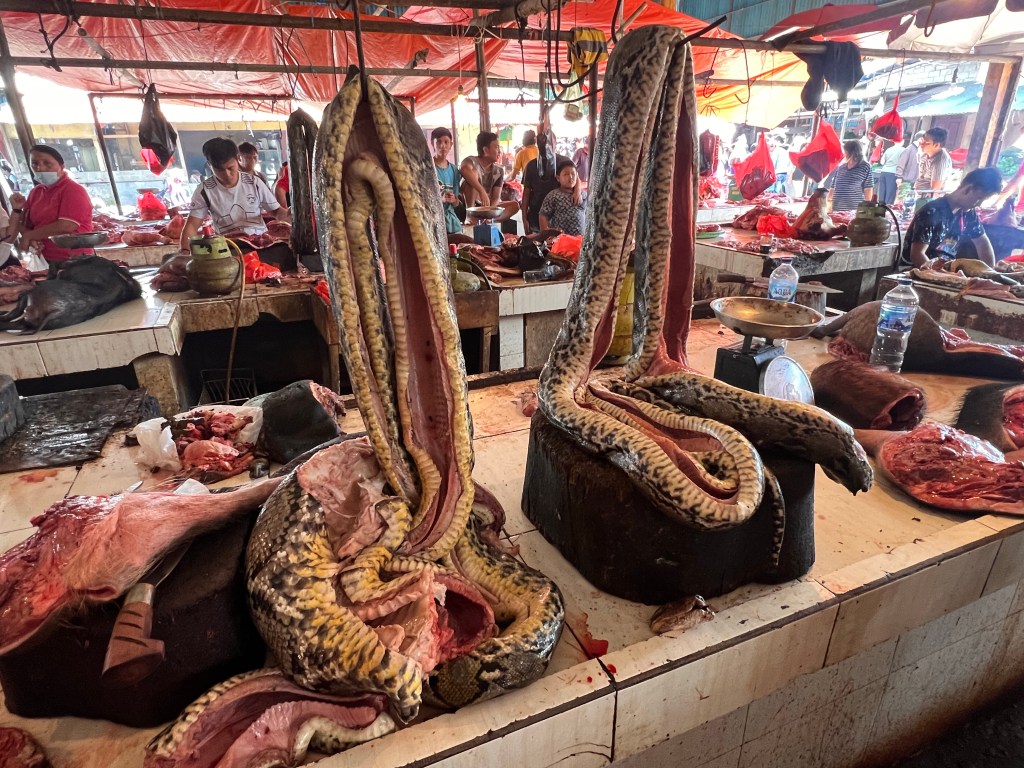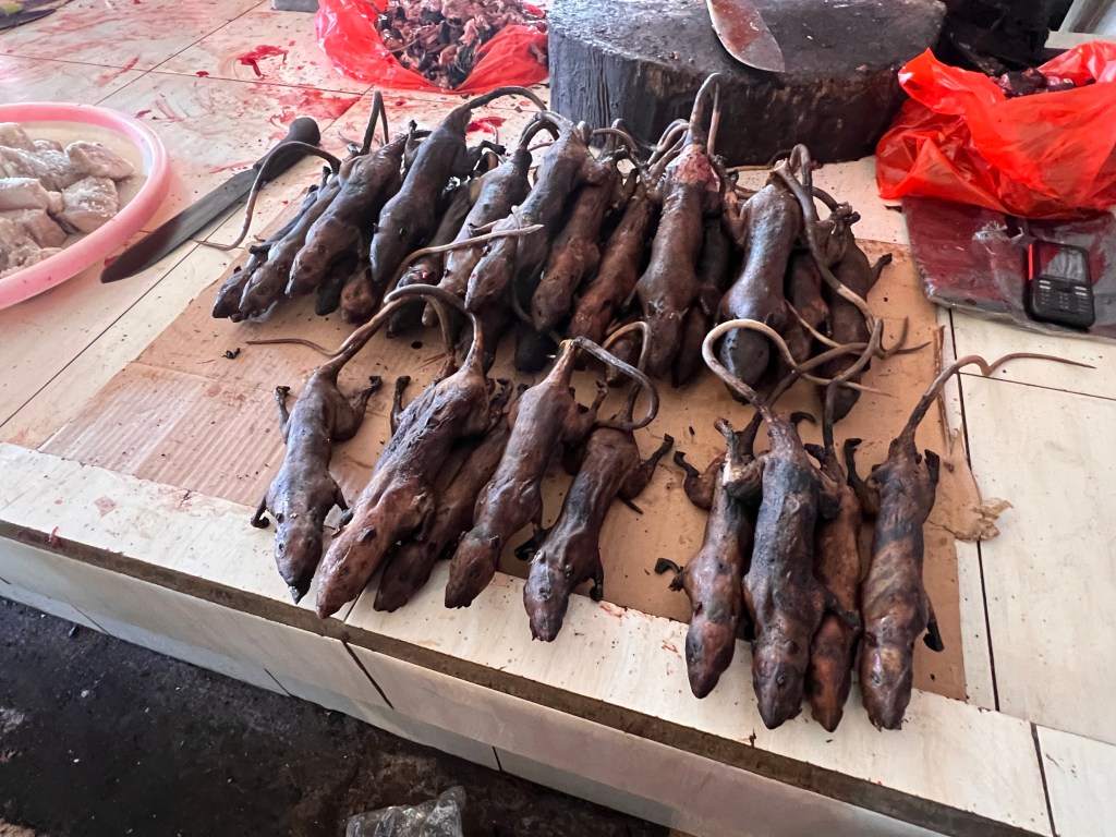 Sejumlah hewan yang dagingnya dijual di pasar ini di antaranya adalah kucing, anjing, tikus hutan, kelelawar, dan ular. Sebagian besar sudah dipanggang, hanya ular piton yang masih berupa potongan daging mentah.
