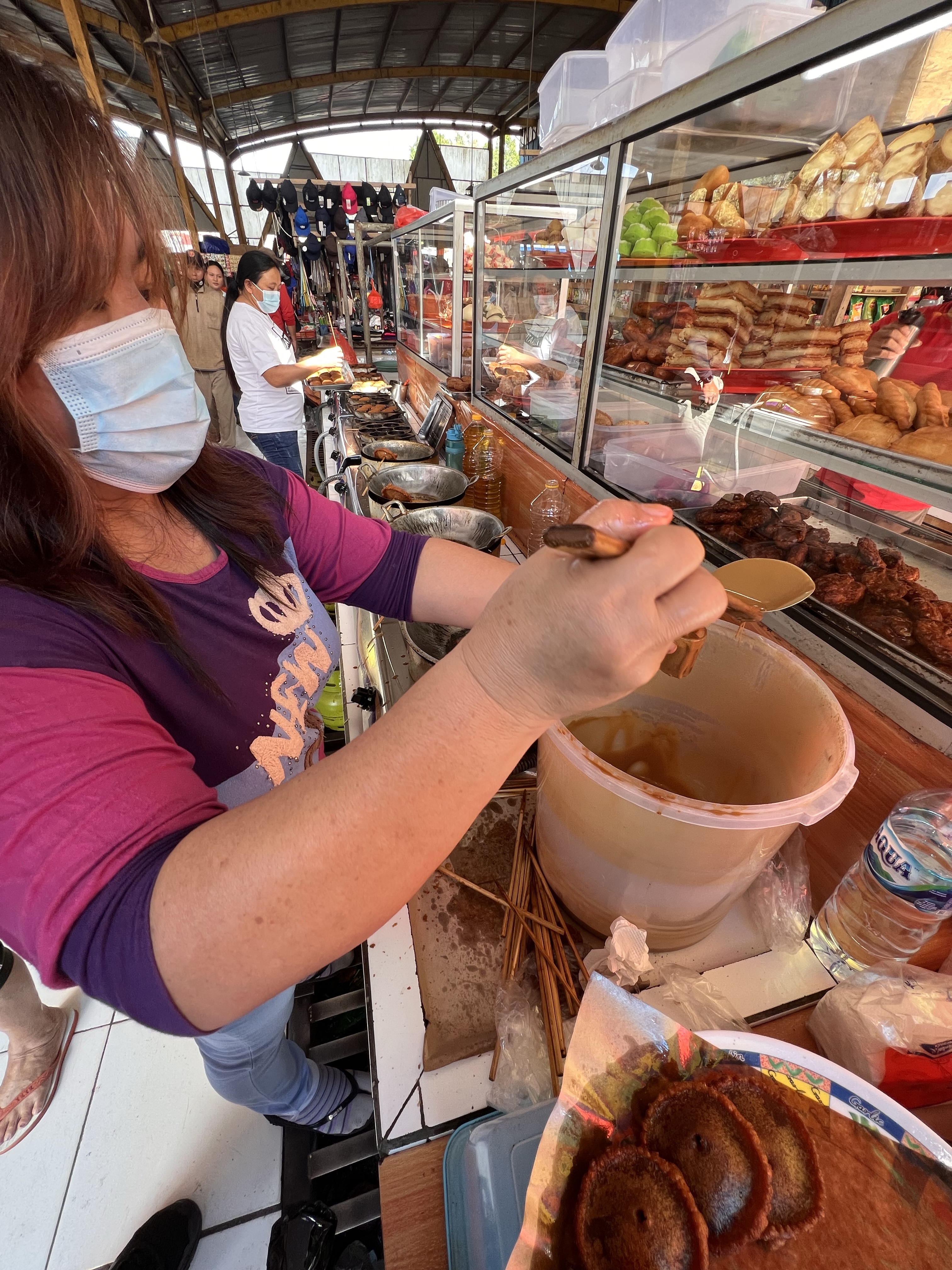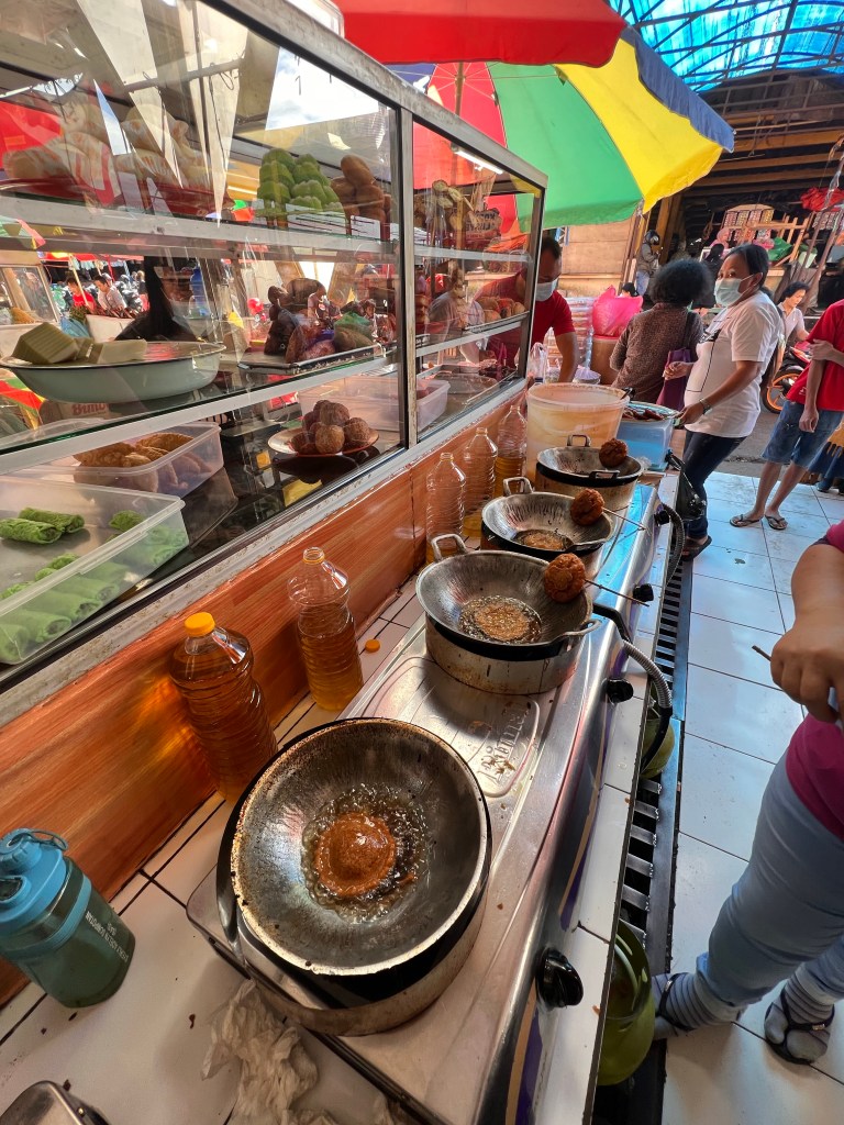 Perpaduan antara pemandangan dan aroma yang ekstrem itu pada awalnya sempat membuat saya agak mual, namun setelah beberapa saat berada di sana, saya jadi lumayan terbiasa. Bahkan ketika di sana, saya sempat mencicip kue cucur yang juga dijajakan di pasar itu.