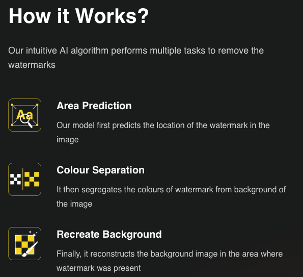 WatermarkRemover kemudian akan melakukan analisa dan prediksi terhadap area pada sebuah foto yang diperkirakan terdapat watermak dan kemudian memisahkan warna demi warna. Langkah selanjutnya adalah tugas dari algoritma teknologi kecerdasan buatan untuk mengisi area pada foto tersebut yang telah dimodifikasi dengan komponen yang sesuai dengan gambar keseluruhan foto tersebut.