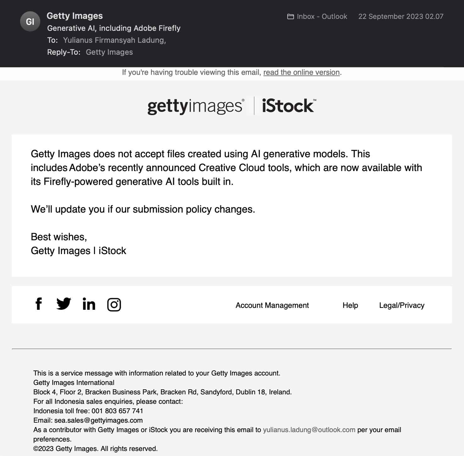 Pada email tersebut disampaikan bahwa Getty Images menolak seluruh karya yang dihasilkan dengan menggunakan AI dan menyampaikan bahwa Getty Images masih belum menentukan kebijakan yang akan mereka ambil dengan AI (termasuk terkait dengan fitur Generative Fill yang tersedia bagi para pengguna Adobe Firefly di Adobe Photoshop).