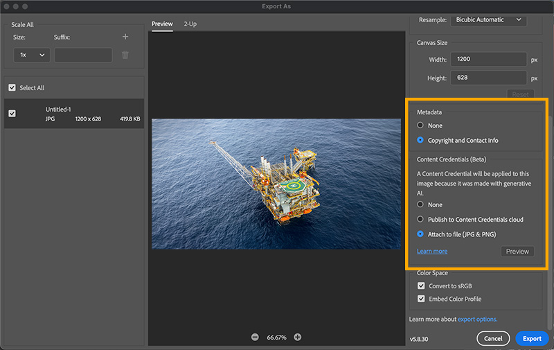 Langkah ketiga setelah selesai melakukan modifikasi, lantas dilakukan export terhadap file foto tersebut. Untuk Adobe Photoshop versi 25.0 pada menu export sudah tersedia secara default fitur Content Credentials (gambar 3).