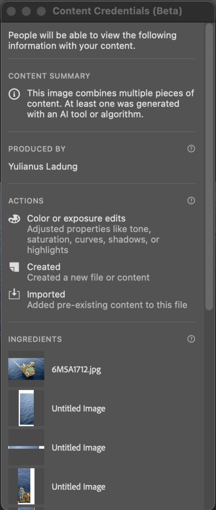 Langkah keempat pada menu export terdapat pilihan untuk menyertakan informasi Content Credentials pada foto yang telah dimodifikasi. Kita bisa melakukan pratinjau atau preview terhadap riwayat perubahan atau modifikasi apa saja atas foto tersebut (gambar 4 dan gambar 5).