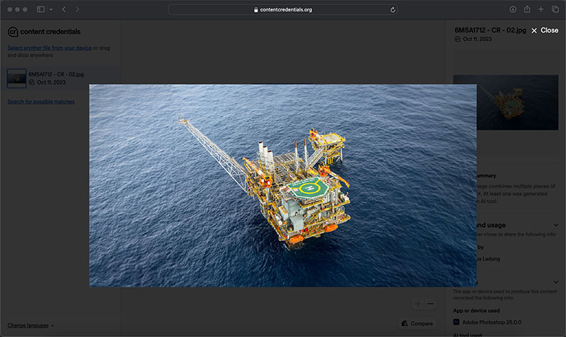 Langkah kelima bukan laman Content Credentials dan unggah file foto yang telah dimodifikasi tadi ke laman tersebut (gambar 6).