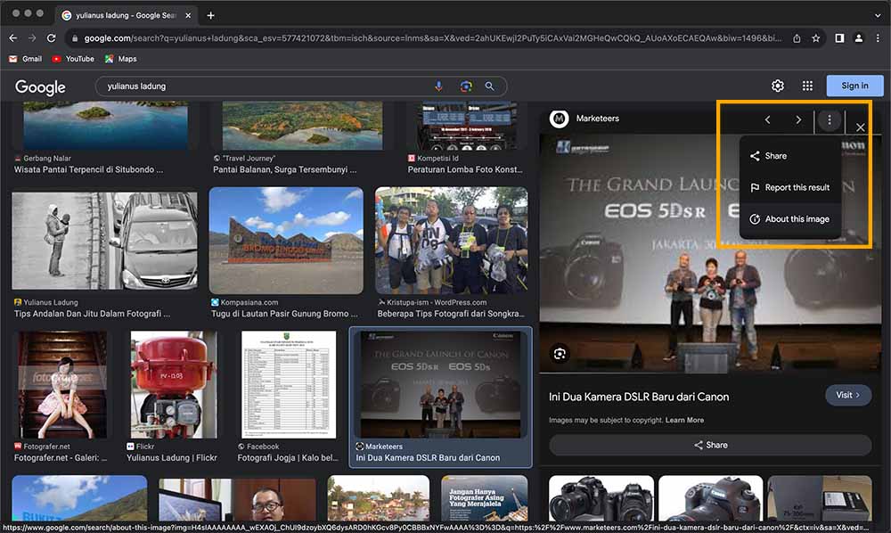 Pada contoh di atas, saya bisa dengan mudah melakukan pencarian informasi tentang kapan sebuah foto itu mulai tedeteksi oleh Google di internet dan foto tersebut sudah ditayangkan atau di muat pada situs internet apa saja.