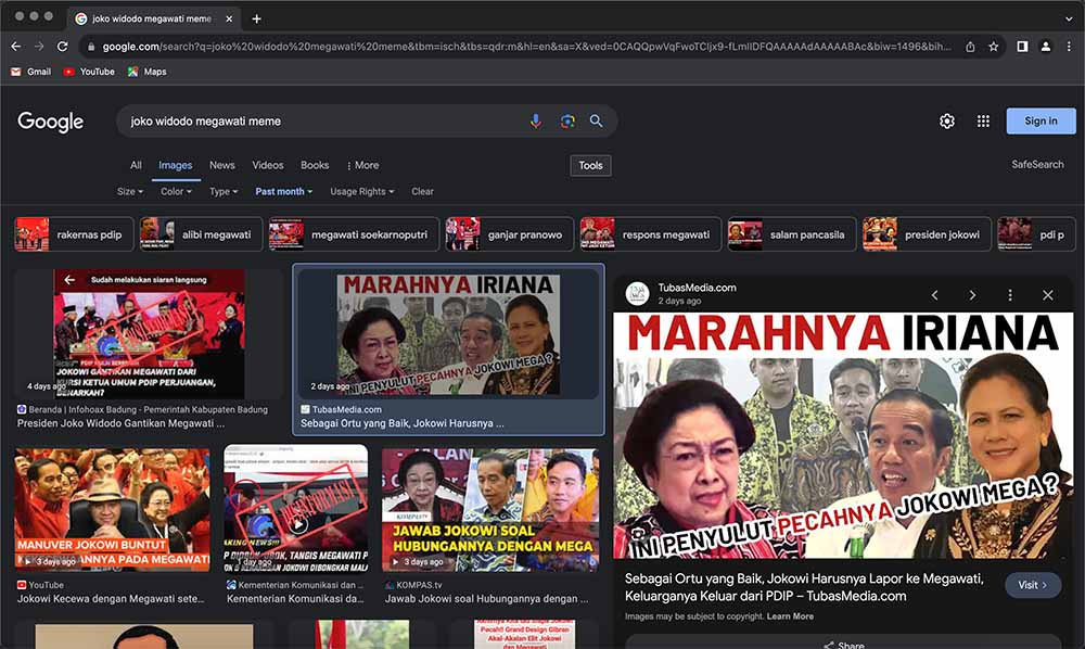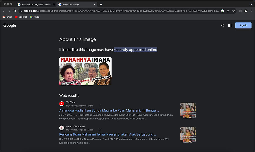 Contoh selanjutnya saya menggunakan keyword Joko Widodo Megawati meme dan Michael Jackson meme, dan seperti yang ditampilkan berikut ini, fitur About this image dapat membantu saya untuk mendapatkan informasi perihal riwayat informasi visual tersebut.