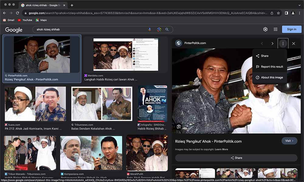 Selanjutnyaa saya menggunakan keyword Ahok Rizieq Shihab. Fitur About this image juga dapat menyajikan informasi tentang manipulasi foto karya kawan saya; Agan Harahap. Informasi seperti kapan foto itu mulai beredar di internet berikut dengan detail informasi lainnya.