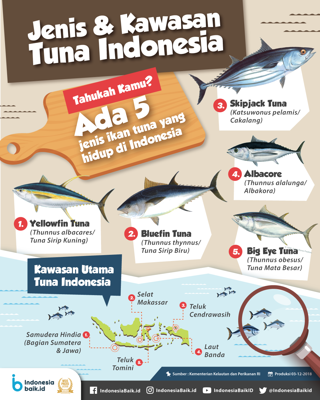 Terdapat lima jenis ikan tuna yang ada di Indonesia, yaitu tuna mata besar (bigeye tuna), madidihang (yellowfin tuna), albakora (albacore), cakalang (skipjack tuna) dan tuna sirip biru selatan (southern bluefin tuna).
